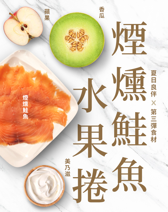 1️.燻鮭魚片對半切,香瓜及蘋果切成長條狀備用。